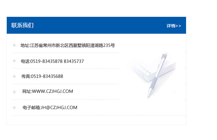 地址:常州市新北區友邦商務大廈1幢16、17層  電話:0519-85101652  傳真:0519-85112595  郵編:213022  網址:www_cz-jiayue_cn.dipingzn.com  郵箱:xiajifengaa@163.com
